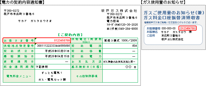 ※「電力の契約内容通知書」【ご契約内容】、「電気使用量のお知らせ」の「お客さま番号」(10桁の数字)または、「ガスご使用量のお知らせ」のお客様番号横()内の10桁の数字です。