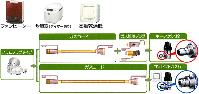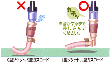 接続する場合には、ガス機器及び接続具の取扱説明書をよく読んでいただきその内容を理解し、接続口の形状やサイズに合ったものをご使用ください。