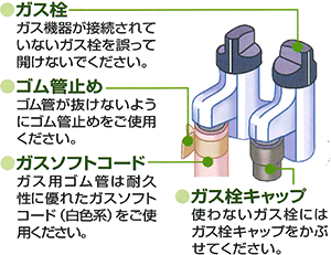 ガス栓とガス機器をガスソフトコードやガスコードで接続する際は、必ず機器側をはじめに接続してください。