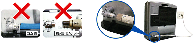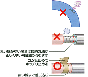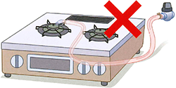 ゴム管は、ガス機器の高温部(コンロの下など)に近接させないように接続してください。